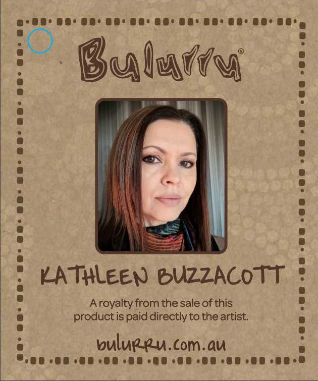 Kathleen is an accomplished entrepreneur, artist, designer and poet, of Pitatjantjara/Western Arrernte, Scottish and English descent. Her mother's country is the South West Petermann Ranges, with storylines that extend to Uluru. Born in Alice Springs, she spent her formative years living in Queensland with her brother and sister in the care of their father. In 1980 when Kathleen was 10 years old, the siblings returned to Central Australia to live with their mother and their people. Kathleen began painting alongside her sister Julie Page in 1993. Kathleen's artworks are a joyful celebration of her Indigenous heritage and also reflect life stories of her two sons growing up on their father's country west of Alice Springs. This is also the location of the famous Kathleen Buzzacott Art Studio, where she produces and sends beautiful all over Australia and the world.
