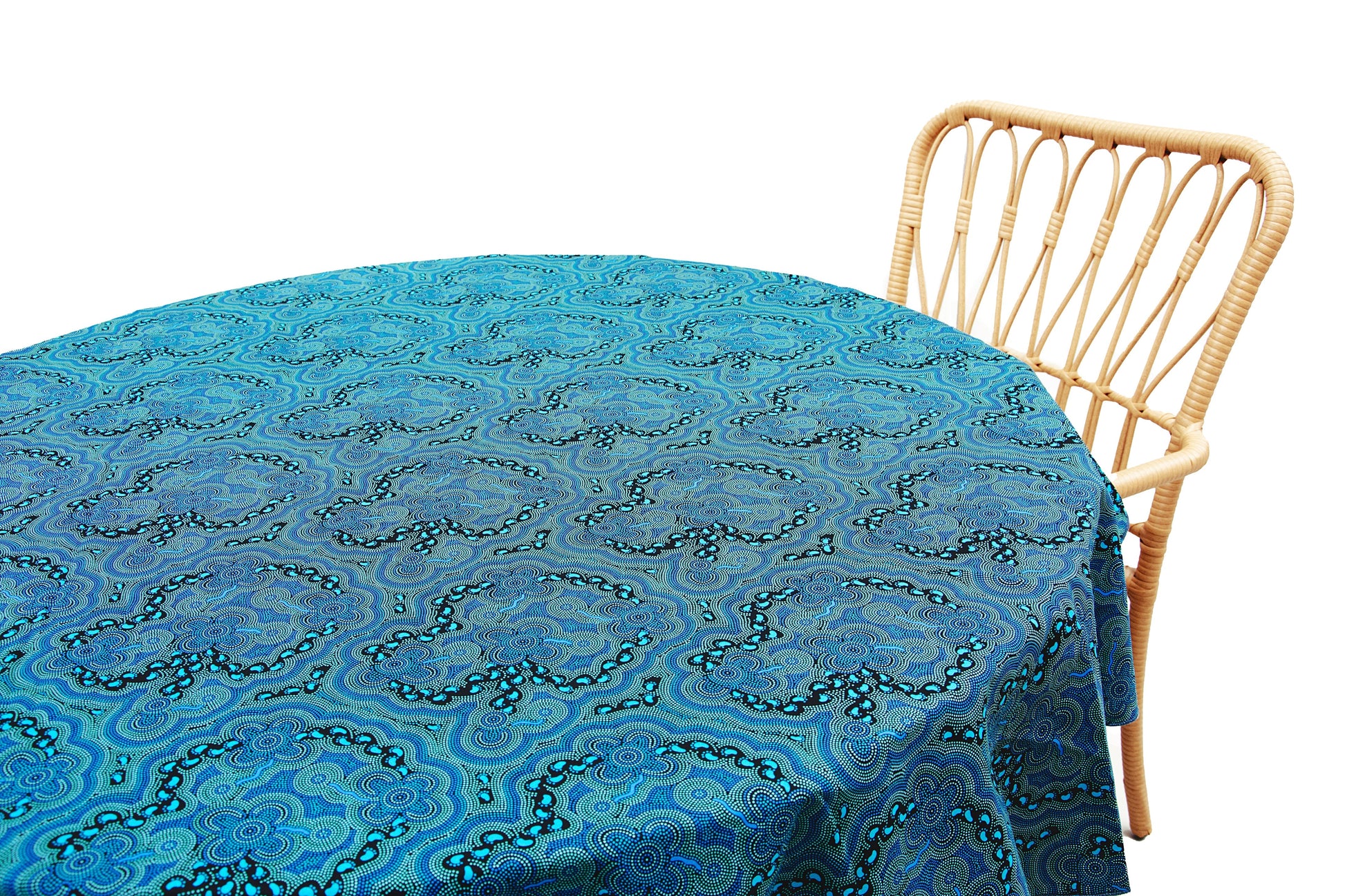 Australian made Aboriginal Round Tablecloths featuring authentic Aboriginal Designs printed on 100% homespun cotton.