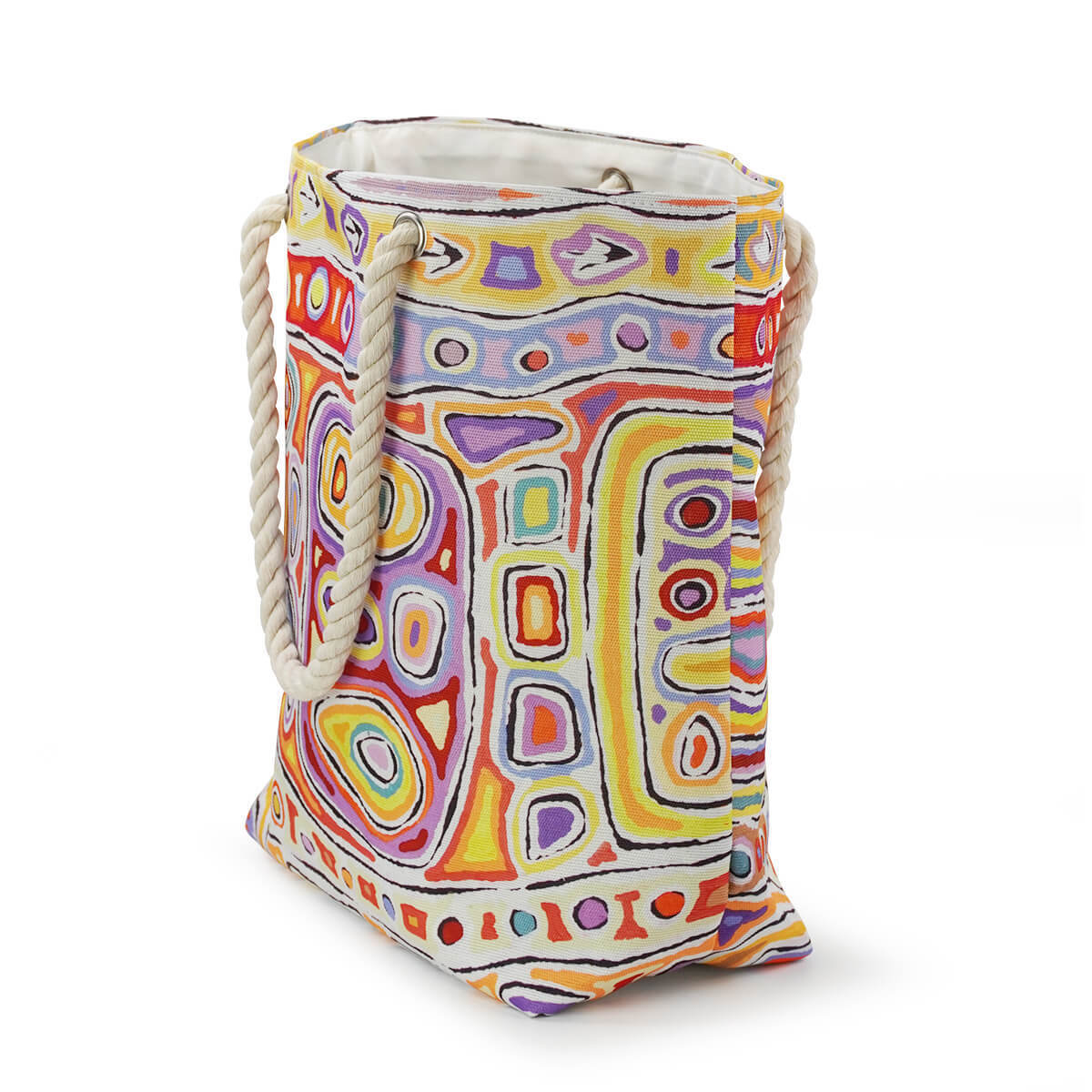 Our spacious canvas carry-all is reinforced to handle the everyday & more. Use as a beach bag, tote bag, overnight bag or as a stylish and functional storage solution. Made from durable canvas Bright and colourful designs featuring the work of acclaimed First Nations artists Internal pocket for wallet, phone, keys Rope handles