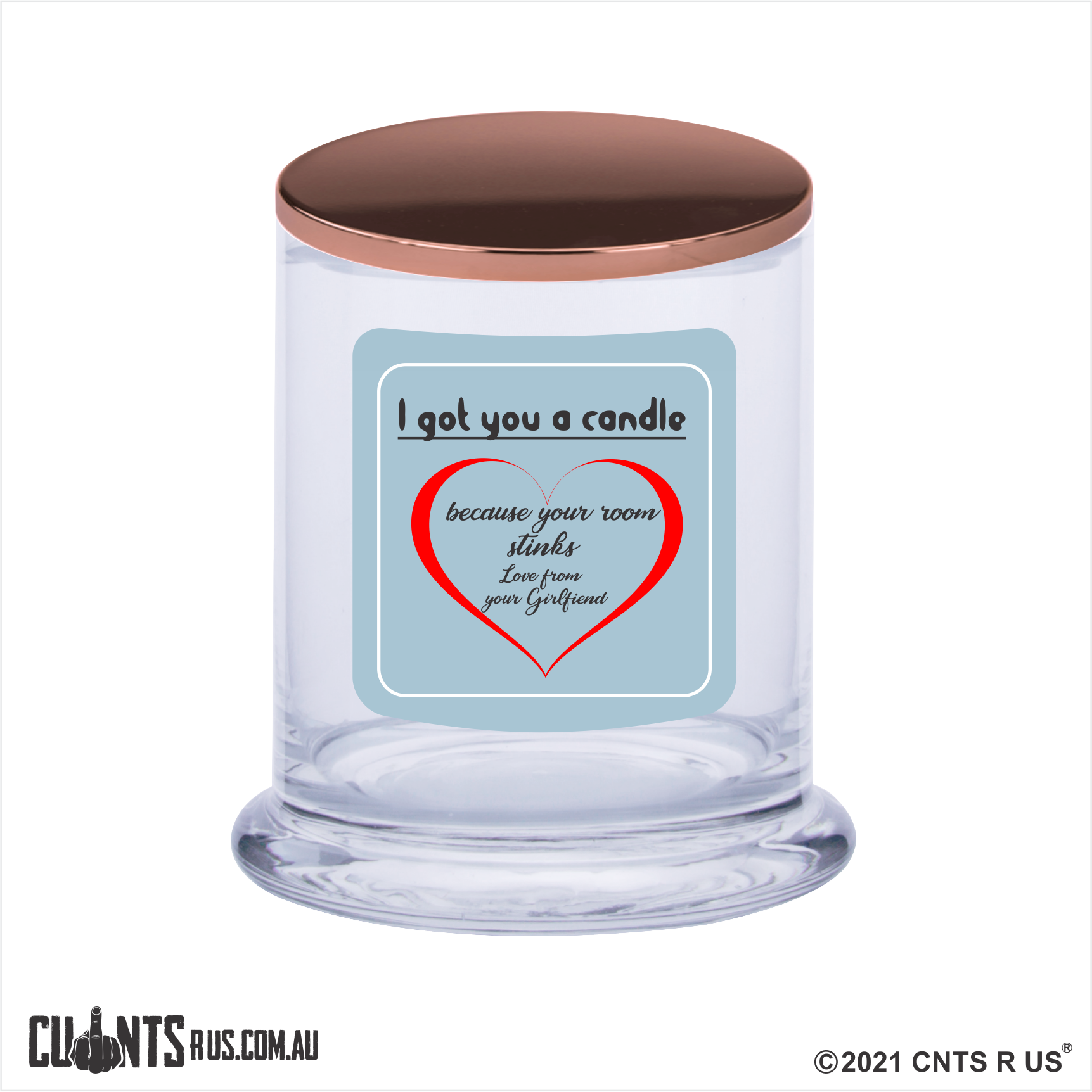 - Clear glass candle inside with "I Got You A Candle Because Your Room Stinks" label