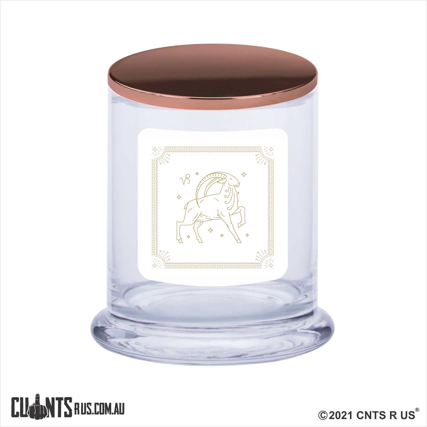 - Clear glass candle inside with Star Sign label "Capricorn The Sea Goat"
