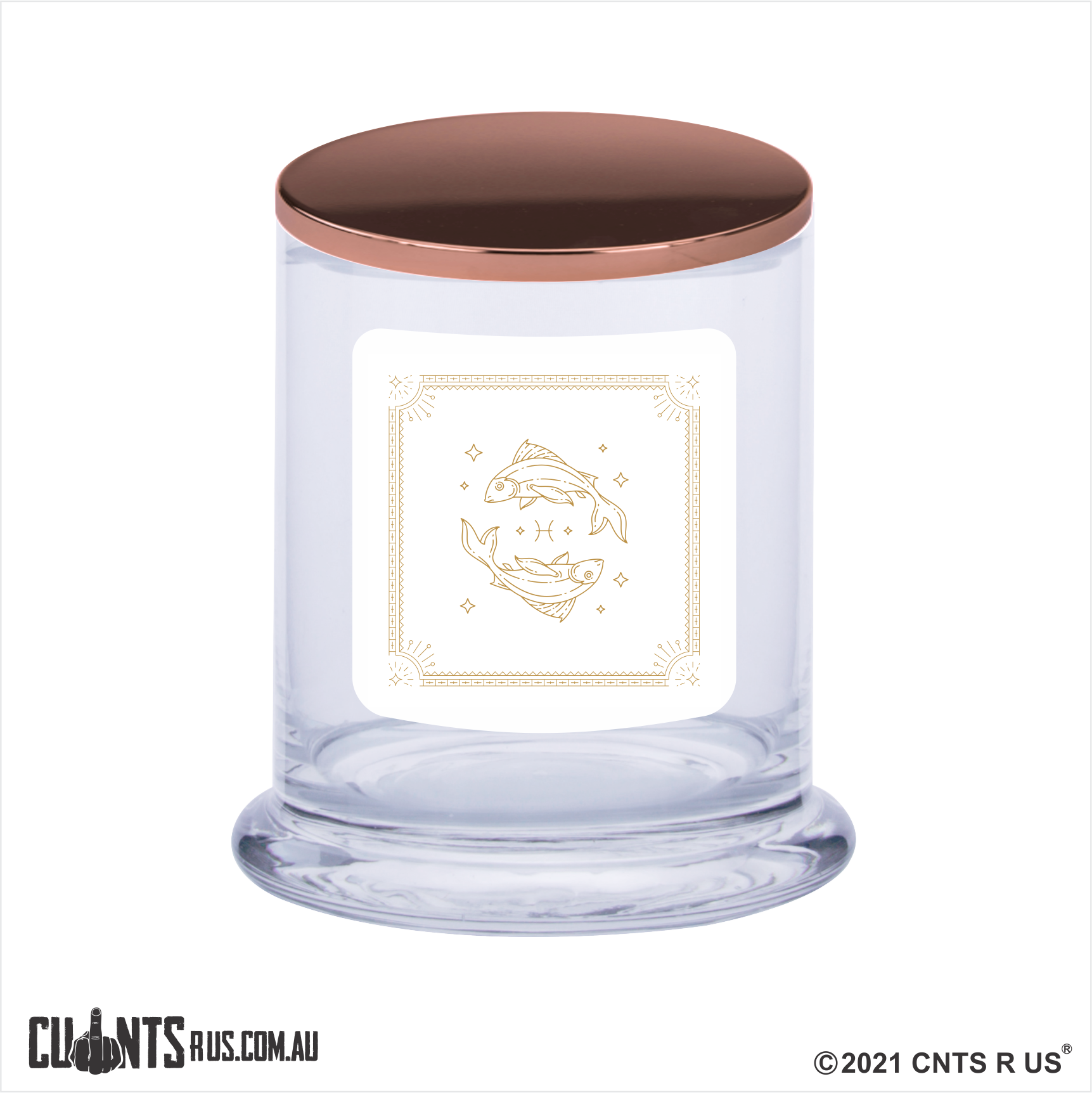 - Clear glass candle inside with Star Sign label "Pisces The Fish"