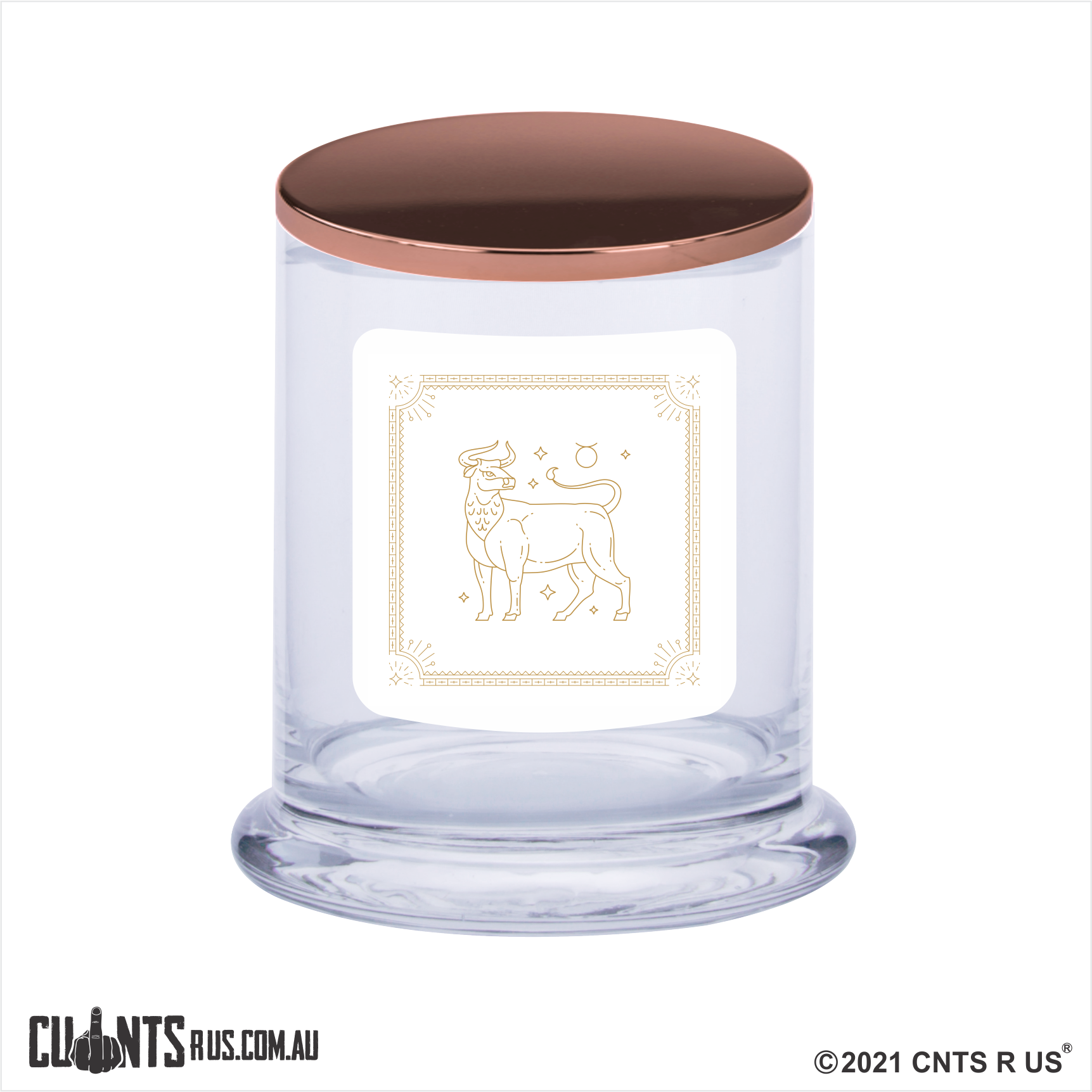 - Clear glass candle inside with Star Sign label "Taurus The Bull"