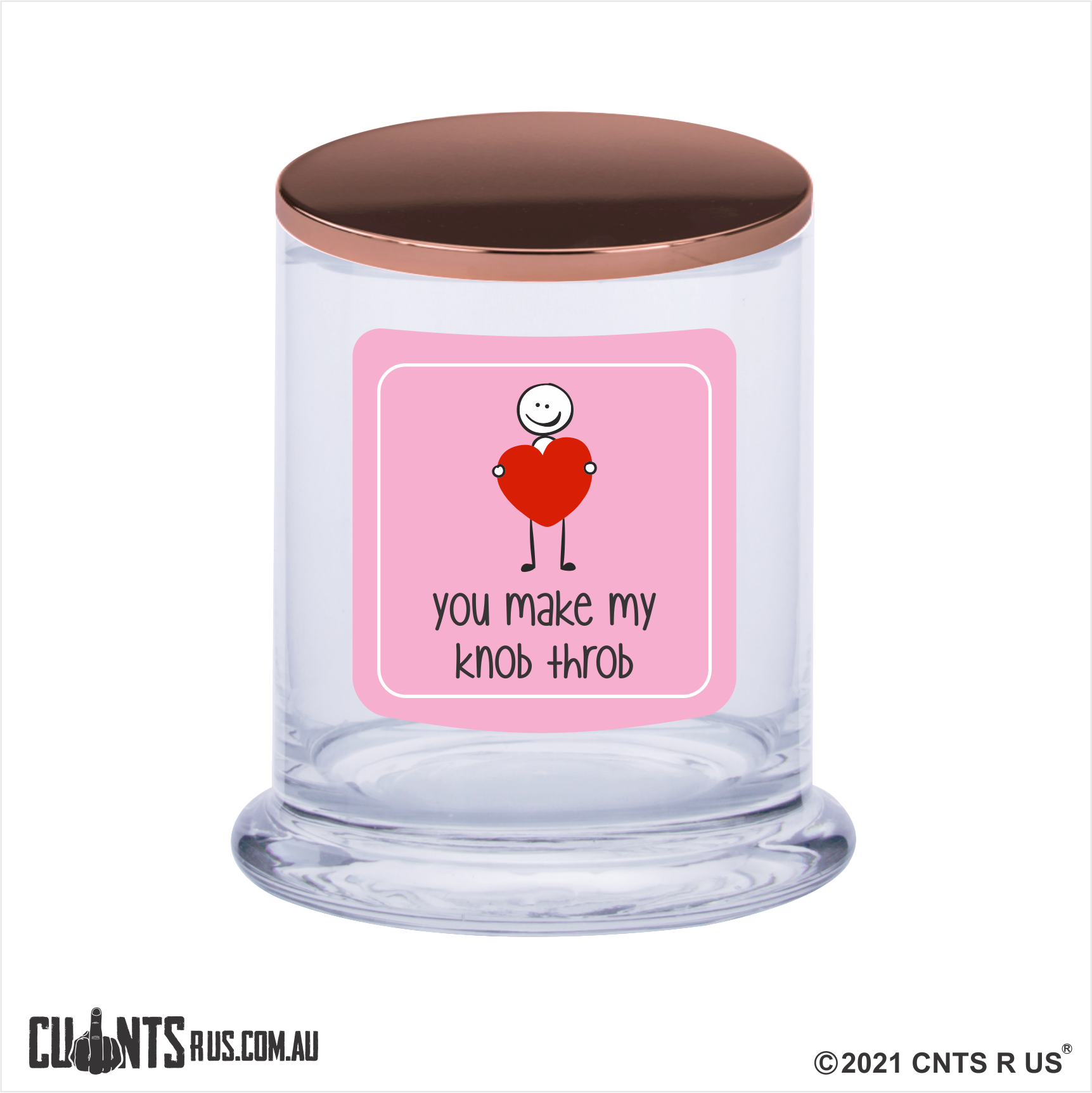 - Clear glass candle inside with "You Make My Knob Throb" label